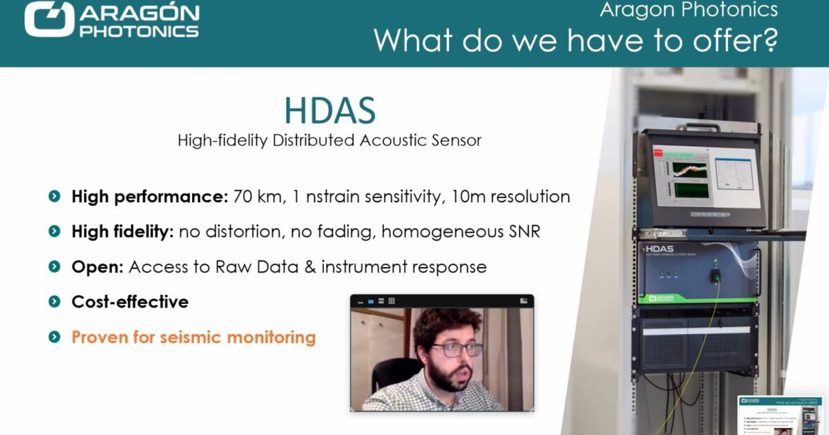Aragon Photonics participated in this section named «Industry Talks» where several companies presented our solutions for the seismology sector. Thus, our colleague Javier Vidal presented our HDAS team, an interrogator capable of detecting earthquakes using fiber optic cables, both terrestrial and undersea.